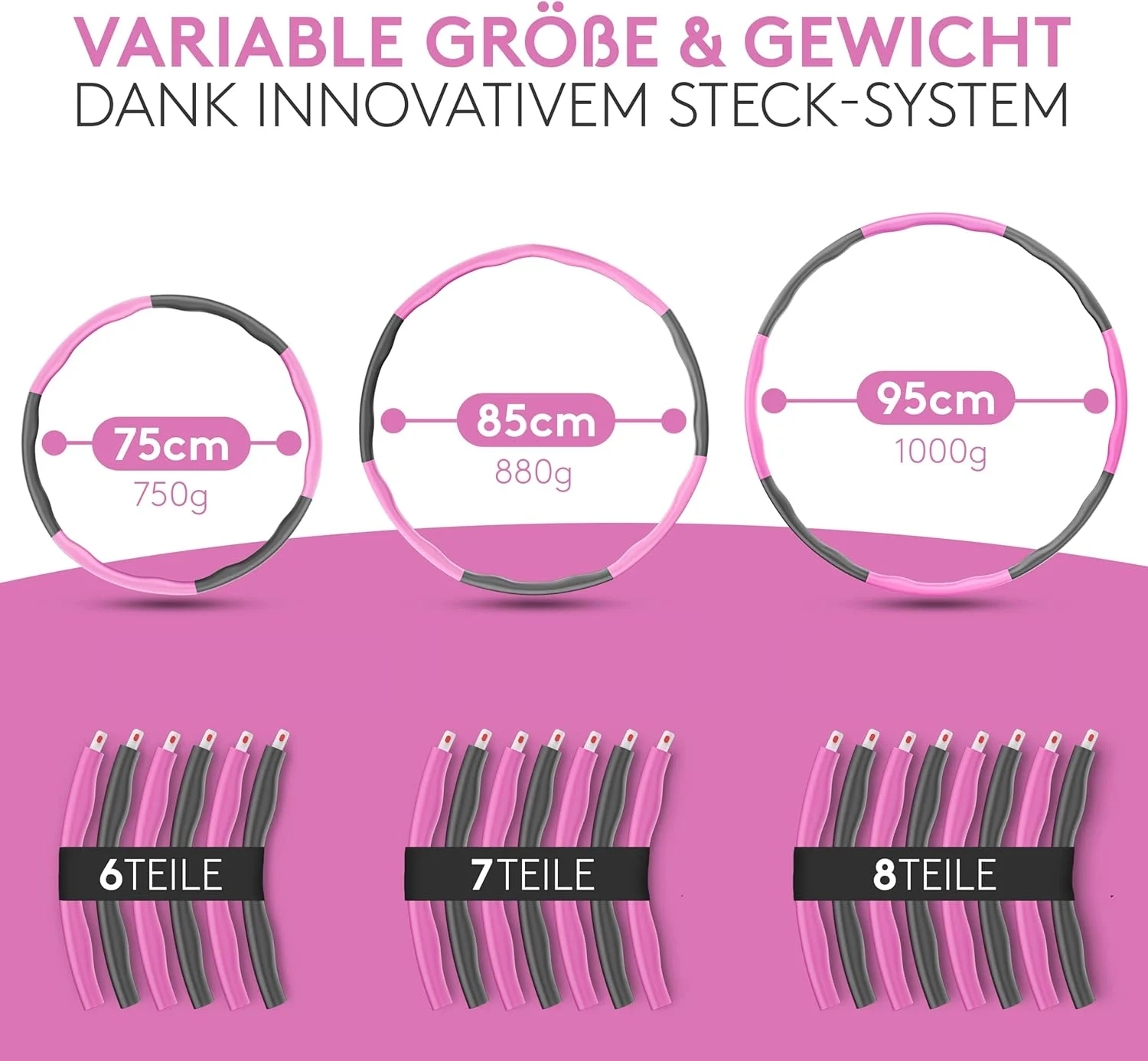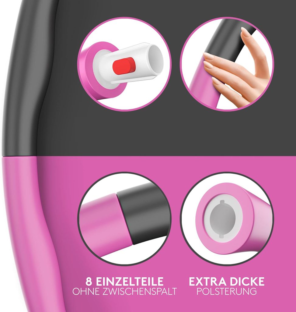 - به لطف سیستم یک کلیک، می توانید هولا هوپ خود را به راحتی و به سرعت کنار هم قرار دهید. پس از تمرین، می توانید حلقه را به 8 قسمت جداگانه جدا کنید تا فضای ذخیره سازی صرفه جویی شود.