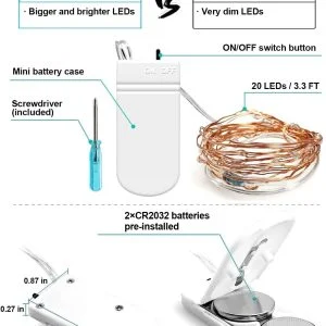 - باطری چراغ های پری ما از سیم مسی انعطاف پذیر 3.3 فوتی و 20 ال ای دی فوق العاده روشن استفاده می کند. طبق تحقیقات بازار، مشتریان بیشتری طول سیم کوتاهتر را ترجیح میدهند، بنابراین تعداد 20 چراغ LED را حفظ کردیم، اما طول سیم را به 3.3 فوت کوتاه کردیم، که باعث میشود بدون نیاز به پیچیدن دایرههای زیاد، هر شکلی را که دوست دارید بسازید.
