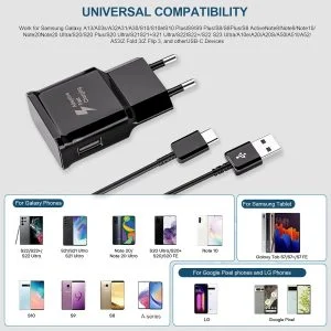 • سازگاری گسترده: سازگار با Samsung Galaxy S23، S23 Ultra، S23 Plus، S22، S22 Ultra، S22 Plus، S21، S21 Ultra، S21 Plus، S20، S20 Plus، S20 Ultra، S10، S10e، S10 Plus، S9، S9+، S8. S8 Plus، Note 8، Note 9، Note 10، Note 20، A10، A11، A12، A20، A50، Google Pixel، Pixel 2، Pixel 3، Pixel XL، LG G5، G6، G7، V20، V30 ThinQ Plus، Htc، Zte Axon، Nexus 6p و دیگر دستگاه‌های USB Type C