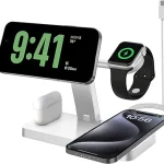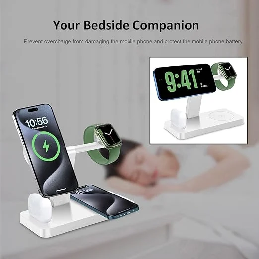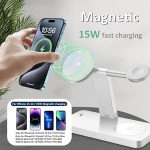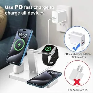 - شارژر بی سیم مغناطیسی 4 در 1 مغناطیسی با آهنرباهای با کیفیت بالا داخلی. ایستگاه شارژ مغناطیسی می تواند بهترین موقعیت شارژ بی سیم دستگاه شما را دقیقاً تراز کند، شارژر بی سیم مغناطیسی می تواند 4 دستگاه را همزمان شارژ کند، برای آیفون، تلفن اندروید، اپل واچ و ایرپاد کار می کند.
