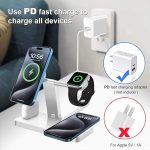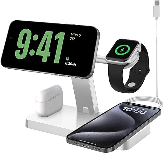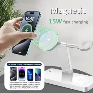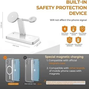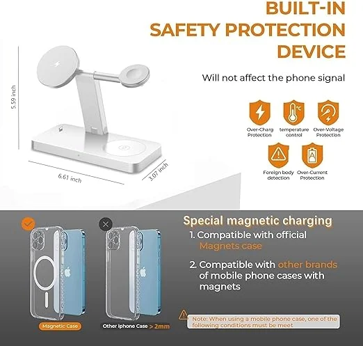 - پایه شارژ تاشو برای قاب گوشی: پایه شارژ گوشی و ساعت را می توان تا کرد که حمل آن آسان است و برای مسافرت، تعطیلات یا سفر کاری مناسب است. جاذبه مغناطیسی قوی: 360 درجه قابل چرخش، تلفن خود را به صورت عمودی یا افقی قرار دهید تا بلافاصله شارژ شود، و از تلفن خود در حین شارژ استفاده کنید. قسمت شارژ مغناطیسی از قاب گوشی موبایل پشتیبانی نمی کند. این فقط با قاب های MagSafe و سری آیفون 12/13/14/15 سازگار است.