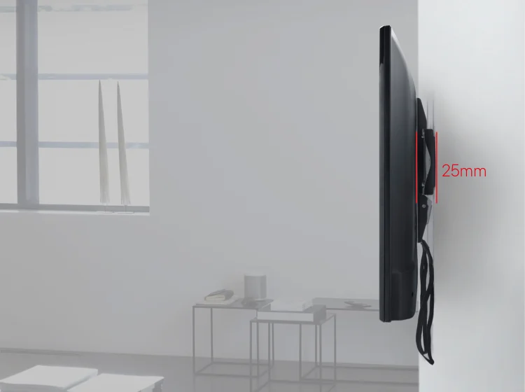 این پایه دیواری با مشخصات کم، فاصله دیوار تا تلویزیون را تنها 25 میلی متر ثابت می کند، اما برای تهویه تلویزیون شما کافی است.