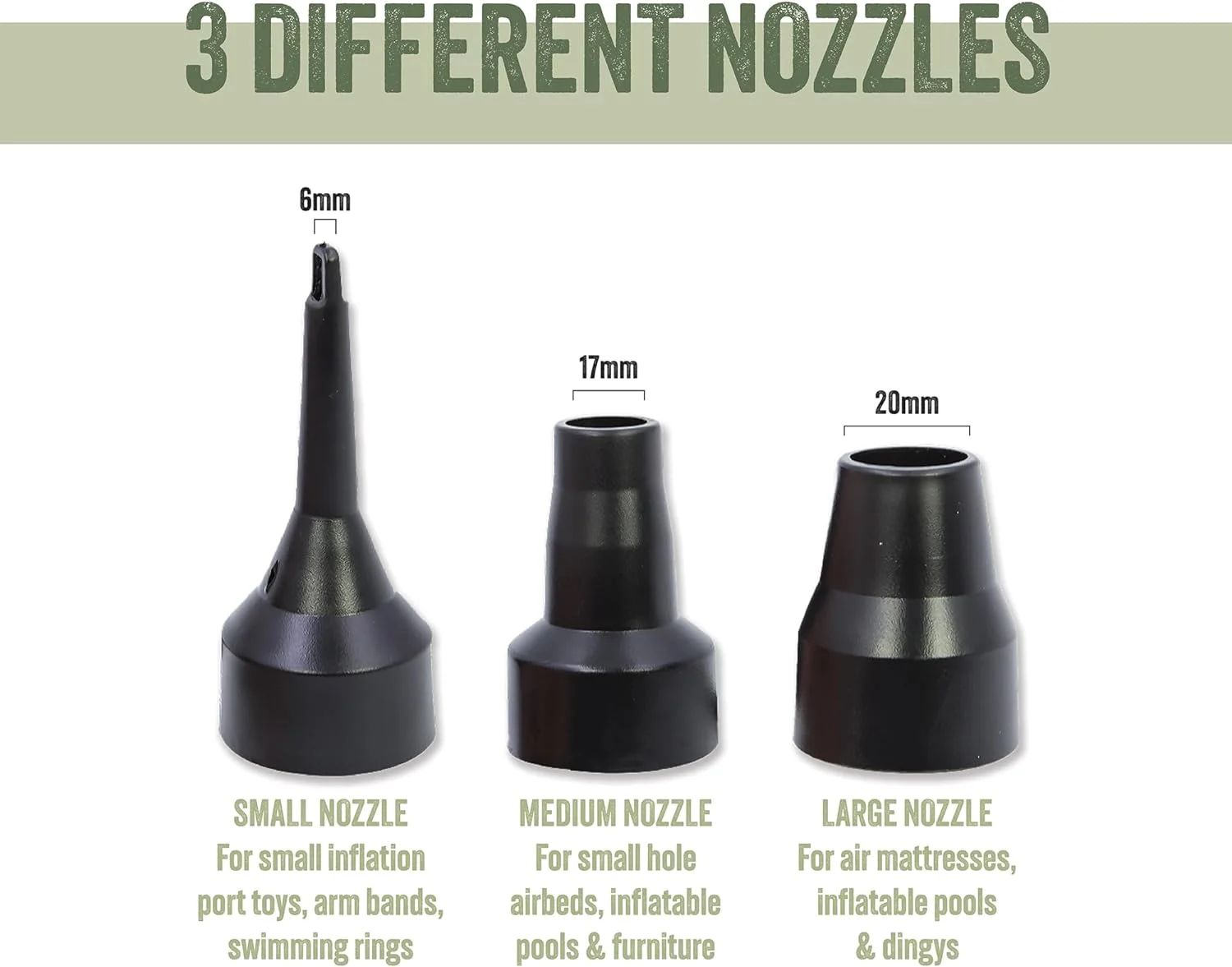 - شامل 3 نازل – پمپ هوا دارای 3 نازل با اندازه های مختلف است که به سادگی به بدنه اصلی دستگاه متصل می شود و با تمام اتصالات شیر استاندارد مطابقت دارد.