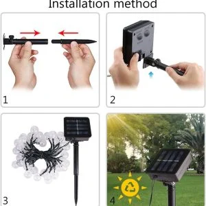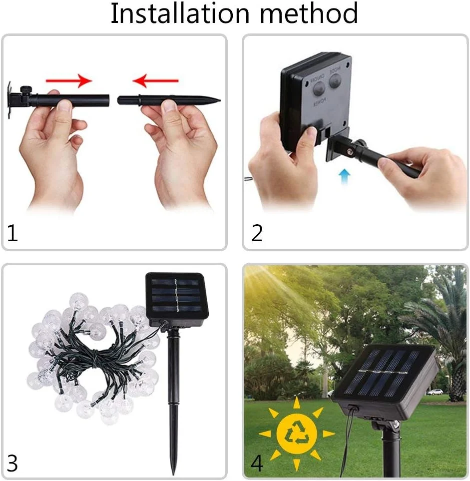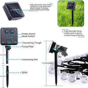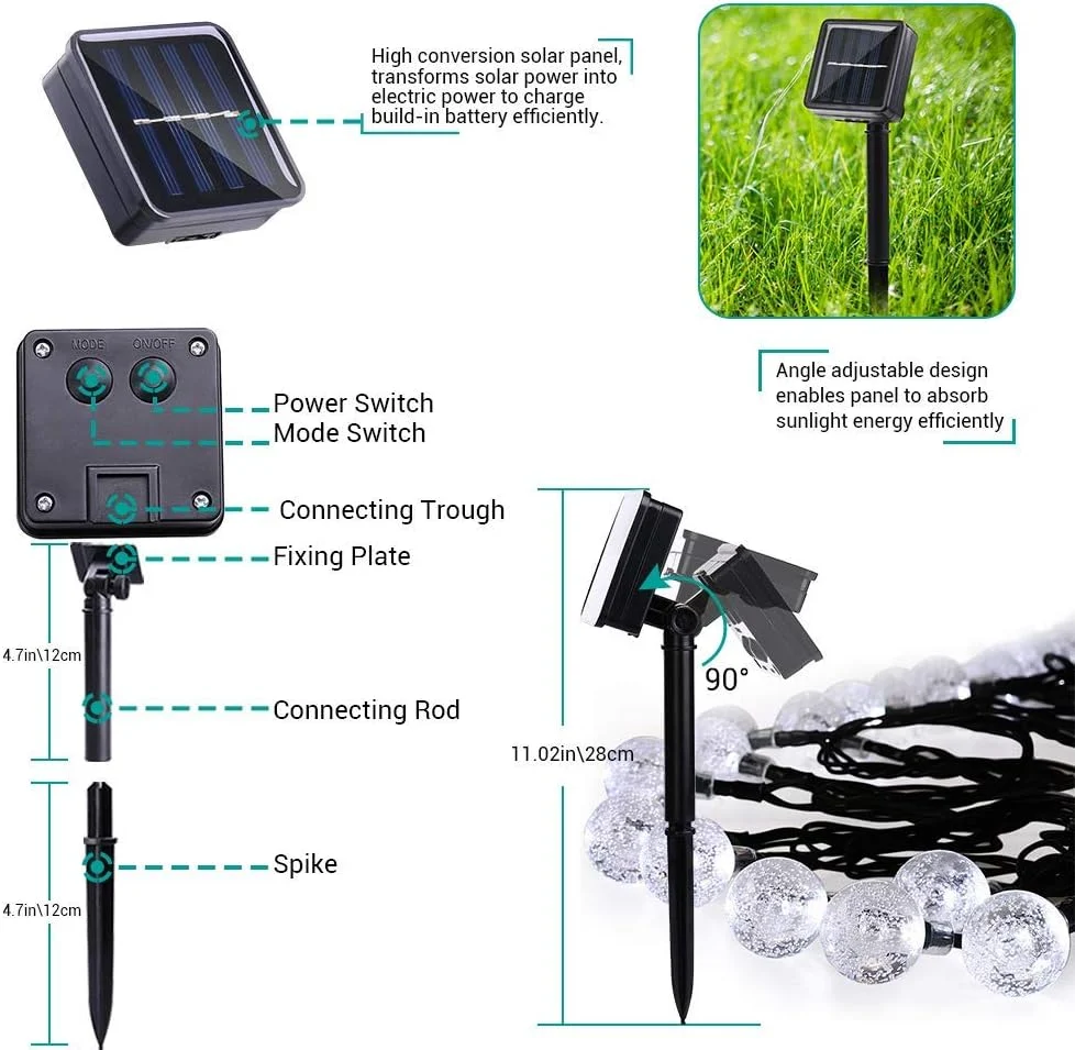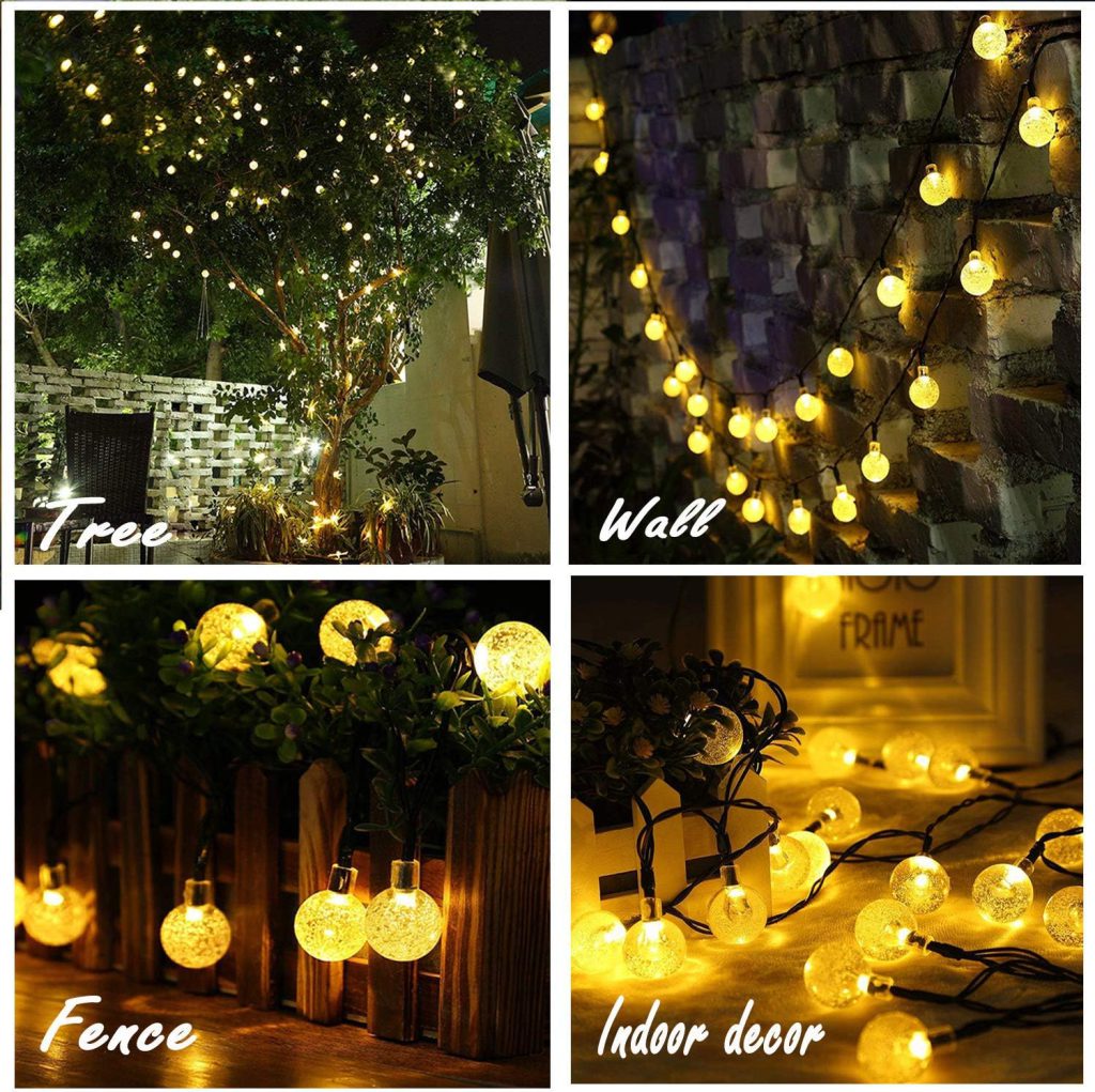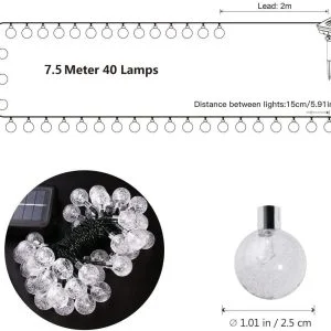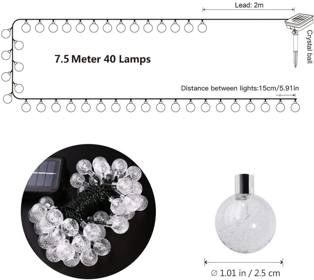 - 40 گلوله کریستالی ریز زیبا (قطر 1 اینچ) برای مقاومت در برابر باران خفیف یا نشت آب طراحی شده است. با طراحی ضد آب، این نور رشته خورشیدی را می توان حداقل برای 30000 ساعت استفاده کرد.